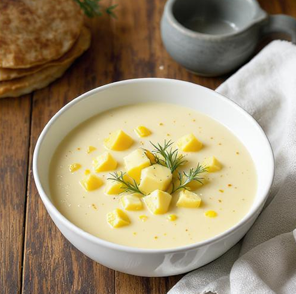 Sopa cremosa de maíz tierno con queso fundente, un clásico reconfortante de los hogares del norte de México, especialmente en Chihuahua y Durango.
